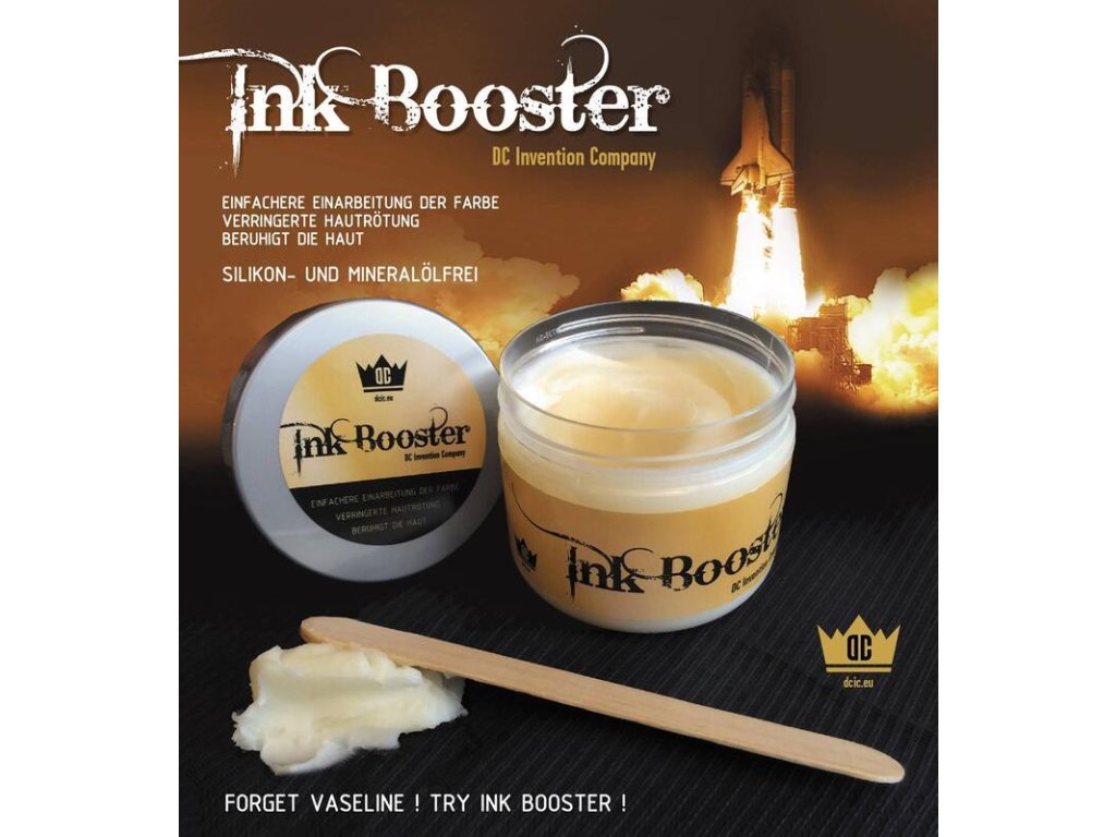 Ink Booster je určený na použitie počas tetovania. Vyhladzuje pokožku, čím zaisťuje jednoduchšiu aplikáciu farieb, zmierňuje začervenanie, krvácanie a vďaka špeciálnemu zloženiu aj bolesť. Neobsahuje vazelínu, minerálne ani silikónové oleje. Dodávaný je v praktickom balení 250 ml, má príjemnú vanilkovú arómu vďaka ktorej je veľmi obľúbený medzi tatérmi aj ich zákazníkmi.