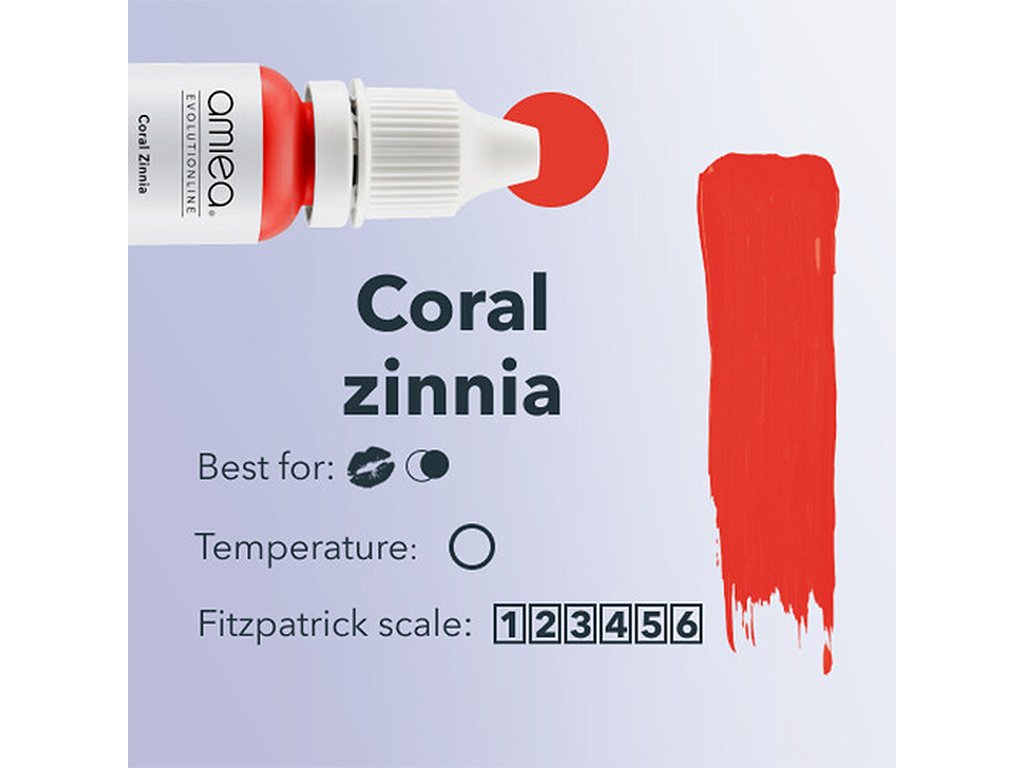 Amiea Coral Zinnia nabízí krásný korálový tón s hustou barvou, díky čemuž je ideálním základem pro světlé směsi. Coral Zinnia slouží jako korektor pro překrytí tmavých rtů, neutralizuje studené odstíny a lze ji použít čistou pro podmanivou pigmentaci rtů.
