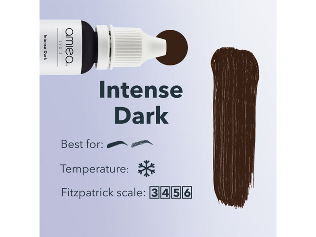 Amiea - Intense Dark je najtmavší z našich EVO2 pigmentov na obočie. Má studený podtón a extra tmavý nádych. Tieto vlastnosti z neho robia perfektnú farebnú zhodu pre klientky s čiernohnedým obočím všetkých typov pleti, a preto je pigment, ktorý si môžu vybrať všetci umelci PMU, ktorí chcú vytvoriť intenzívne, výrazné a silné obočie.