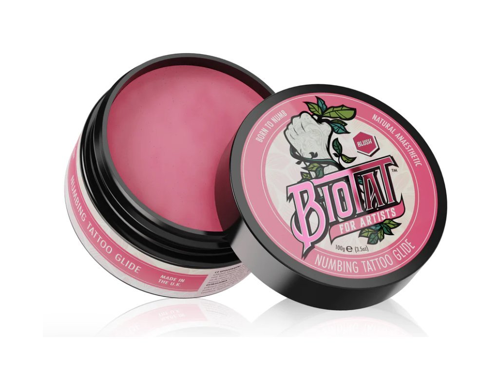 Vazelína s nádychom prírodnej ružovej farby. Používajte ho ako akúkoľvek vazelínu alebo procesové maslo s pridanými výhodami znecitlivenia oblasti a zároveň dramaticky zníženia opuchu a začervenania. Na rozdiel od produktov na báze lidokaínu to nenafukuje kožu, takže je ťažké tetovanie, váš zákazník bude po celú dobu v kľude. Kĺzanie je super hladké a neupcháva ihly ani nezmaže váš prenos. Naši umelci milujú transparentný sklz, umožňuje vám pracovať s čiernou a sivou a svetlejšími farbami s väčšou presnosťou.