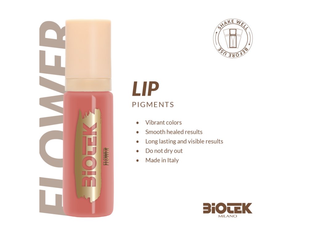 Pigment Biotek Flower 15ml je navrhnutý pre technikov permanentného make-upu a microbladingu pier. Odtieň je popisovaný ako nude s jemným broskyňovým akcentom, ktorý pripomína zamatové okvetné lístky v plnom kvete. Zloženie je vegánske, produkt nie je testovaný na zvieratách a je vyrobený v Taliansku z vysoko kvalitných surovín. Vďaka krémovej textúre farebného média ponúka plné krytie a stabilný výsledok bez nežiaducich posunov farby po zahojení. Balenie využíva air-less technológiu, ktorá umožňuje využitie obsahu až do poslednej kvapky.