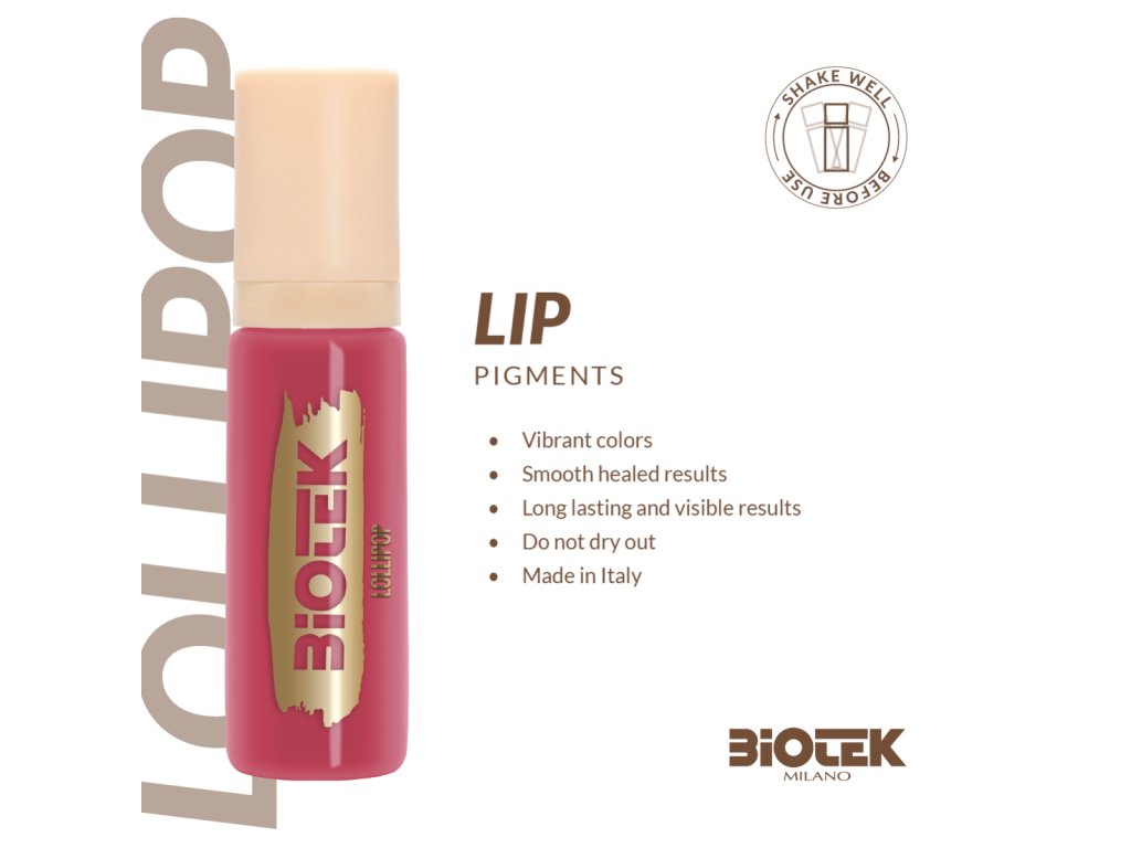 Pigment Biotek Lollipop je navrhnutý pre techniky permanentného make-upu a microbladingu pier a ponúka stredne fialovo ružový odtieň, ktorý pôsobí sviežo a moderne. Vyznačuje sa plným krytím, stabilnou farebnosťou po zahojení a je vyrobený v Taliansku z kvalitných surovín. Formulácia je vegánska, netestovaná na zvieratách a spĺňa európske regulačné požiadavky pre pigmenty. Obal s funkciou air-less umožňuje využiť pigment až do poslednej kvapky, čo zvyšuje efektivitu použitia v profesionálnom štúdiu.