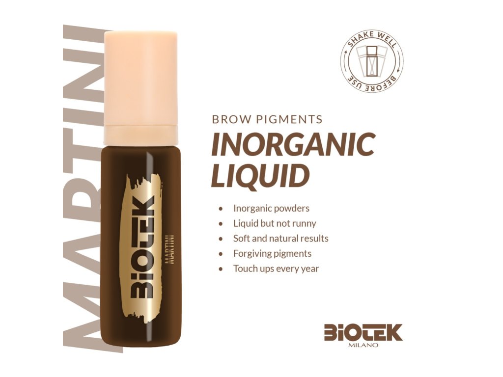 Pigment Biotek Martini je vyvinutý pre techniku „Rapid Shading“ obočia a ponúka mäkký, stredne tmavý hnedo-tmavý odtieň, ktorý je ideálny pre klientky s prirodzene tmavo hnedým chĺpkom obočia a stredne až tmavšou pleťou. Neutrálny podtón minimalizuje riziko nežiaduceho šednutia či červenania po zahojení. Farba je 100% anorganická, vyrobená v Taliansku podľa európskych noriem, vegánska a netestovaná na zvieratách. Vďaka vysokej kvalite pigmentu a technológie implantácie je dosiahnutý stabilný výsledok s plným krytím a dlhodobou farebnou stálosťou.