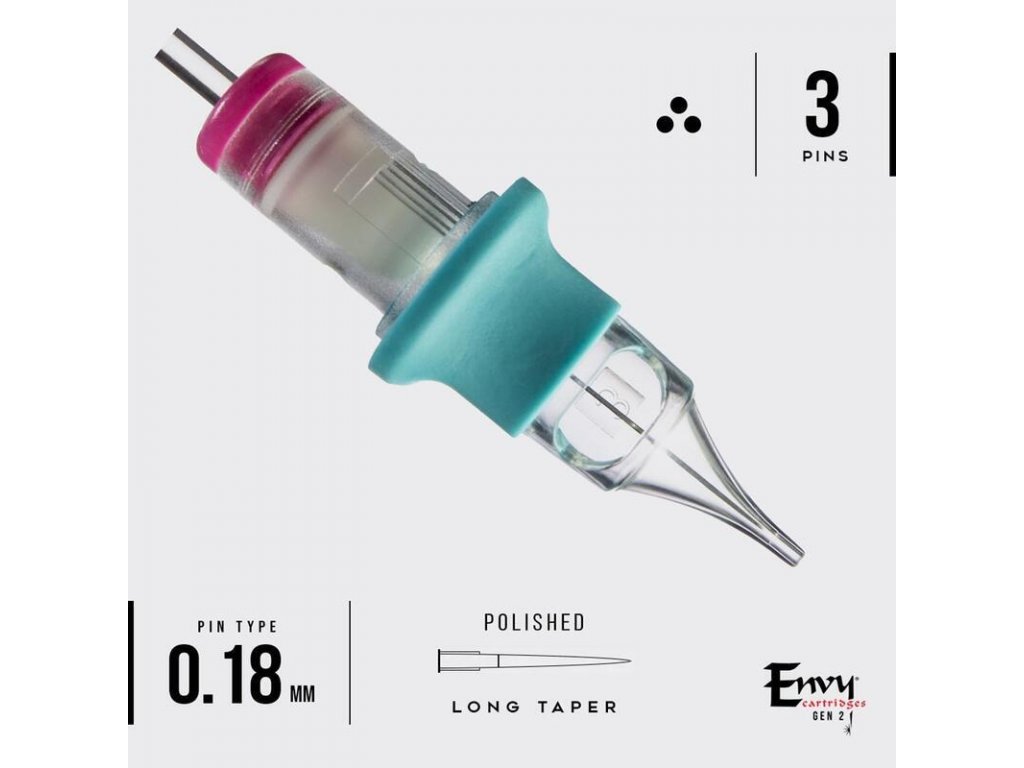 Envy Gen 2 Nano PMU cartridge liner. Populárna a dokonalá voľba pre všetky typy ihiel, používaná pre linky očí a pier, vylepšenia rias, pehy krásy a mikropigmentáciu vlasov. Vyvinuté z cartridgí Envy Gen 2, cartridge Envy Nano prinášajú nové konfigurácie. Špeciálne navrhnuté pre permanentný make-up vrátane mikropigmentácie pokožky hlavy a všetkej estetiky tváre. Kompatibilný so všetkými cartridge strojčekmi od kvalitných značiek, ako sú Cheyenne (Hawk), FK Irons, Microbeau a Bishop Rotary. Cartridge majú membránovú funkciu, ktorá neumožňuje spätný tok atramentu alebo krvi do vášho stroja alebo gripu, čo výrazne zvyšuje úroveň hygieny a skracuje váš čas strávený čistením a sterilizáciou - a čas sú peniaze... Envy Gen 2 Nano PMU kazety sú dodávané v krabičkách po 10 kusoch, každá kazeta je balená jednotlivo v blistri a je sterilizovaná EO plynom. Proces kvality Každá cartridge Envy Nano prechádza 30-bodovým procesom kontroly, než získa názov Envy. Tak sa môže pochváliť najvyšším štandardom QC procesu v odbore, môžete si byť istí, že cartridge Envy Nano budú vždy v maximálnej kvalite. Schválené umelci Umelci podporujú inovácie TATSoul Envy pomocou spätnej väzby umelcov do všetkých návrhov produktov. Komfortné držanie Komfortný návlek na cartridge vám umožňuje väčšiu kontrolu a presnosť s možnosťou oprieť prst ďalej dole bližšie k ihle. Jemnejší detail Navrhnuté a vylepšené tak, aby prekračovalo súčasné štandardy kvality v priemysle estetiky tváre. Envy Nano Cartridges umožňujú umelcom SPMU vytvárať tie najlepšie línie a realistické ťahy vlasov. Balené po 10tich kusoch.