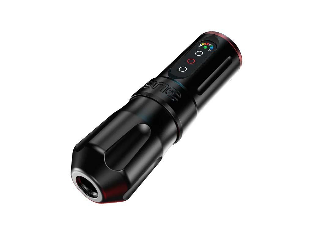 Tento tetovací strojek má lesklý černý povrch a červený rychlootočný kryt baterie. Je vhodný pro silné a plné linky nebo plné barvy.