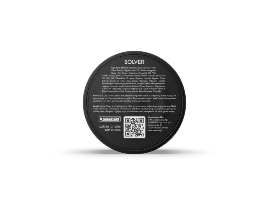 INKTROX Solver Tattoo Process Butter je profesionálne tetovacie maslo navrhnuté na použitie počas tetovania. Slúži na upokojenie pokožky, zlepšenie sklzu ihly a obmedzenie mechanického podráždenia kože pri práci. Konzistencia umožňuje jednoduchú aplikáciu bez zanášania hrotu a bez negatívneho vplyvu na tok pigmentu.