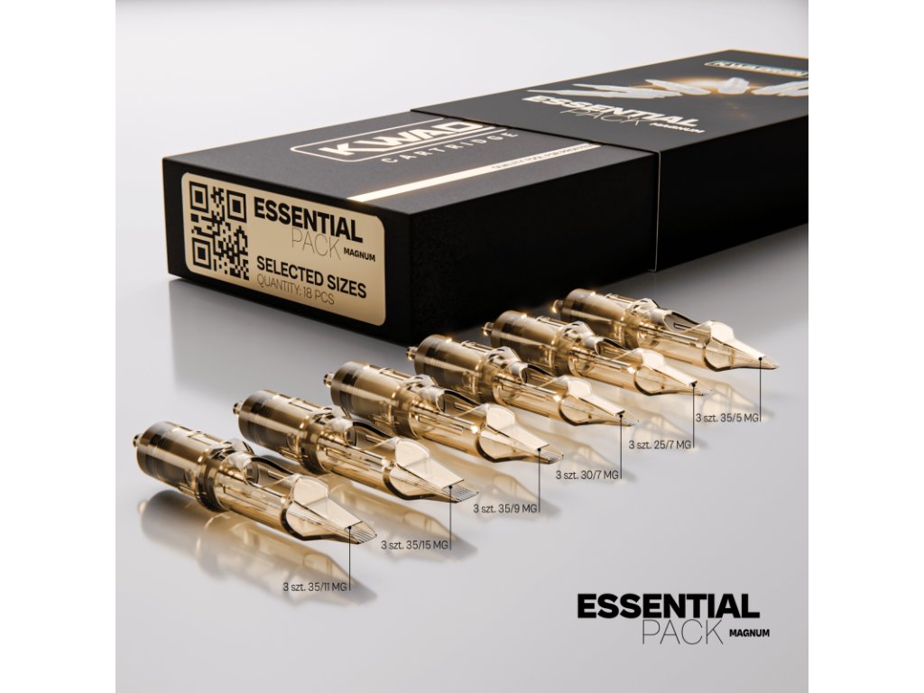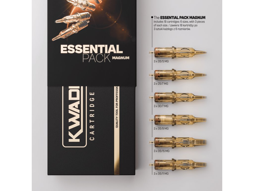 Kwadron Cartridge System Kwadron Cartridge System predstavuje kompletný systém cartridgí navrhnutý pre maximálnu stabilitu, kontrolu a presnosť. Každý prvok systému, od ostrých ihiel cez ochrannú membránu až po stabilizačný mechanizmus, je navrhnutý s dôrazom na plynulý chod a spoľahlivosť pri každom použití. Plná kontrola nad výplňami s Magnum Essential Pack Magnum Essential Pack nie je náhodnou kombináciou veľkostí. Ide o cielený výber magnum konfigurácií, ktoré pokrývajú bežné pracovné situácie pri tieňovaní a vyplňovaní. Ihly zaisťujú rovnomerné ukladanie pigmentu, stabilný tok farby a kontrolu aj pri dlhších sedeniach. Súprava je vhodná ako pre jemné prechody, tak pre sýte a konzistentné výplne bez zbytočného opakovania priechodov. Čo v sade nájdete Celkom 18 cartridgov, 3 kusy od každej veľkosti: • 35/5 MG • 25/7 MG • 30/7 MG • 35/9 MG • 35/11 MG • 35/15 MG Táto kombinácia umožňuje plynulý prechod od menších magnumov pre kontrolovanú prácu až po väčšie konfigurácie. Vlastnosti • Originálny KWADRON Cartridge System • Stabilizačný systém pre konzistentný chod ihiel • Ochranná membrána proti spätnému toku farby • Plast lekárskej kvality • Kompatibilný so štandardnými cartridge strojčekmi