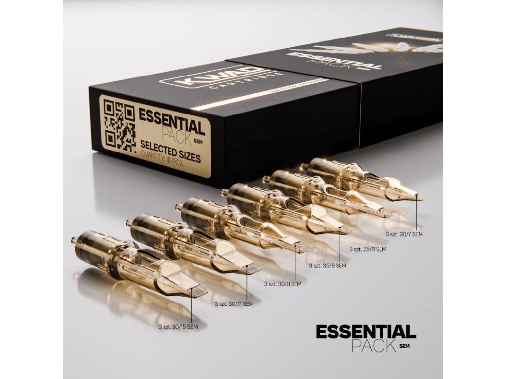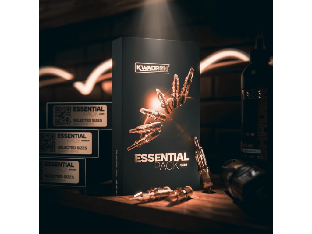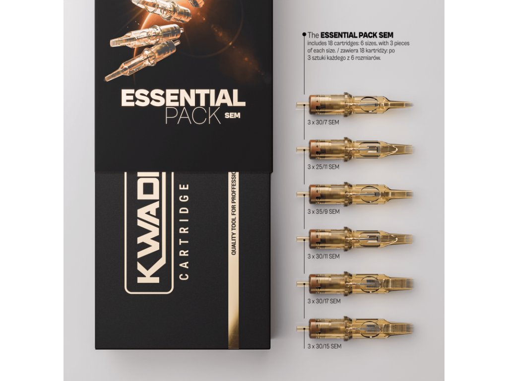 KWADRON Cartridge System SEM Essential Pack je precízne zostavená sada cartridgí určená pre tatérov, ktorí vyžadujú maximálnu kontrolu pri tieňovaní, jemných prechodoch a práci s farbou bez zbytočného traumatizovania pokožky. Nejde o náhodný mix veľkostí, ale o premyslený nástroj na systematickú a opakovateľnú prácu. SEM konfigurácie sú optimalizované pre plynulý tok farby a rovnomerné rozloženie pigmentu. Vďaka tomu je dosiahnutý stabilný výkon pri soft shadingu, realistických prechodov i kontrolovaného vyplňovania väčších plôch. Každá cartridge v sade využíva overený stabilizačný systém KWADRON a ochrannú membránu, ktorá eliminuje spätný tok farby a zvyšuje hygienický štandard práce. Tento Essential Pack je ideálnou voľbou pre profesionálov, ktorí chcú mať po ruke univerzálnu SEM konfiguráciu bez nutnosti kombinovať rôzne krabičky a veľkosti počas sedenia. Technické špecifikácie Výrobca: KWADRON Typ cartridgí: SEM Počet kusov v balení: 18 Počet konfigurácií: 6 Počet kusov od každej konfigurácie: 3 Systém: Cartridge System s ochrannou membránou Použitie: profesionálne tetovanie Obsah balenia Sada obsahuje 18 cartridgí rozdelených do nasledujúcich konfigurácií: 3x 30/7 SEM 3x 3x 30/11 SEM 3x 30/17 SEM 3x 30/15 SEM