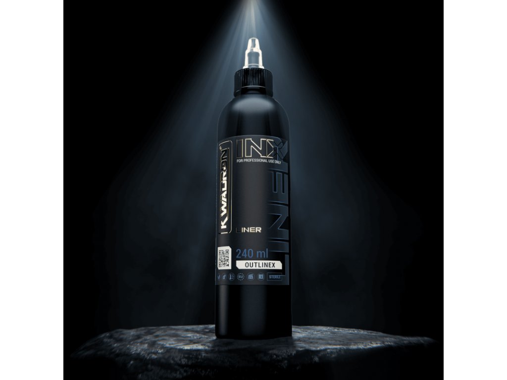 Kwadron INX Outlinex je profesionálny čierny atrament vytvorený špeciálne pre tatérov, ktorí požadujú absolútnu plynulosť a presnosť pri kreslení dlhých kontúr. Vďaka stabilnej konzistencii zostáva atrament bezchybný počas celej práce – netvorí kvapky, nezasychá a zachováva rovnomerne intenzívnu čiernu farbu až do poslednej sekundy tetovania.
