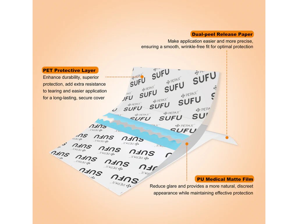 Ochranný film na tetovanie PEPAX® SUFU (15 cm x 10 m) vyrobený z priehľadného matného obväzového materiálu bez obsahu latexu a prachu. Vodotesné a priedušné vlastnosti boli vylepšené. Môže tiež dobre chrániť čerstvé tetovanie, znížiť riziko zjazvenia a nebude mať veľký vplyv na každodenný život.