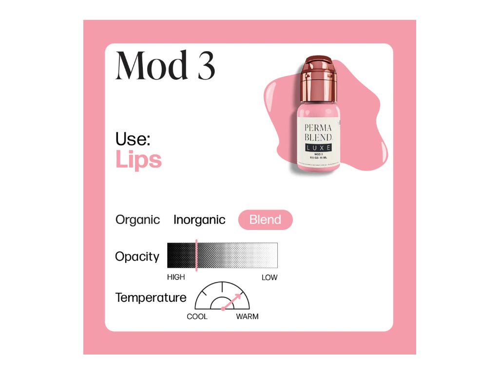 Mod 3 je pigment zo sady Embody. Túto sadu vyvinula Carla Ricciardone v spolupráci s Perma Blend LUXE. Pigment na pery Embody bol špeciálne vyvinutý na neutralizáciu studených a tmavých pier. Sada Carla Ricciardone obsahuje všetky aspekty ošetrenia na neutralizáciu pier, takže môžete pracovať na akomkoľvek odtieni pleti.