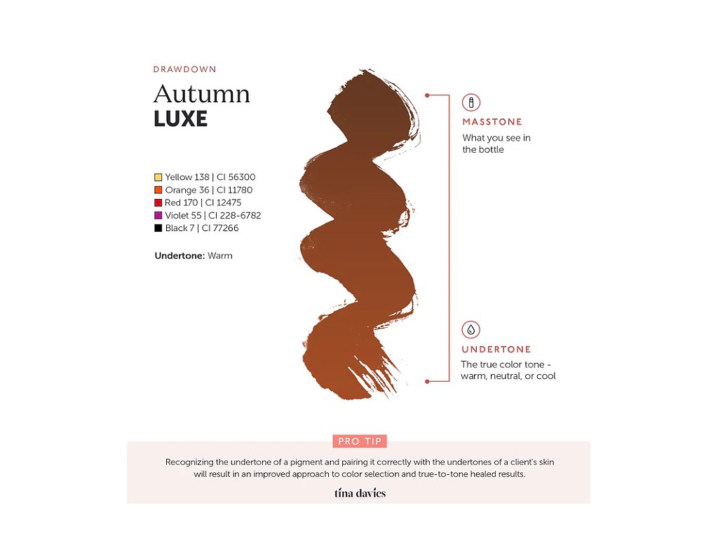 PERMA BLEND LUXE - TINA DAVIES AUTUMN - Hlboký jesenný odtieň. Tento teplý pigment tmavej hodnoty je ideálny pre klientov s tmavšími červenými alebo gaštanovými vlasmi. Použite ho samostatne alebo ako teplý modifikátor pre akúkoľvek farbu. Jedná sa o hybridný prípravok zložený prevažne z organických zložiek.