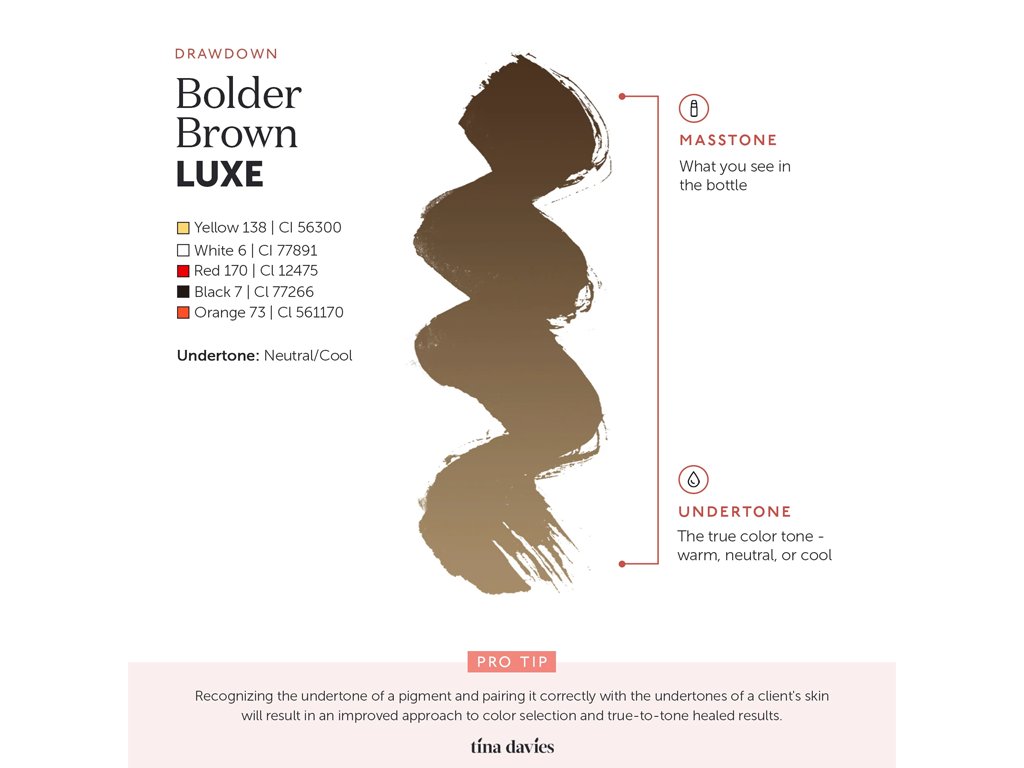Bolder Brown Luxe nahrádza predchádzajúci pigment Bold Brown v rade Perma Blend a je vhodný pre tóny pleti Fitzpatrick 3-5.