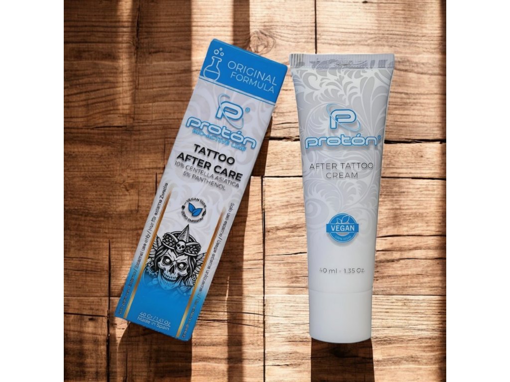 Proton Tattoo After Care Original Formula je originálna receptúra Proton, ktorá predstavuje zásadný posun v profesionálnej starostlivosti o tetovanie. Bola vyvinutá po viac ako štyroch rokoch výskumu v našich vlastných laboratórnych zariadeniach v Španielsku. Tento krém vychádza z praxe tetovacích umelcov, bol vytvorený tetovacími umelcami pre tetovacích umelcov, aby spĺňal skutočné potreby čerstvo potetovanej pokožky.