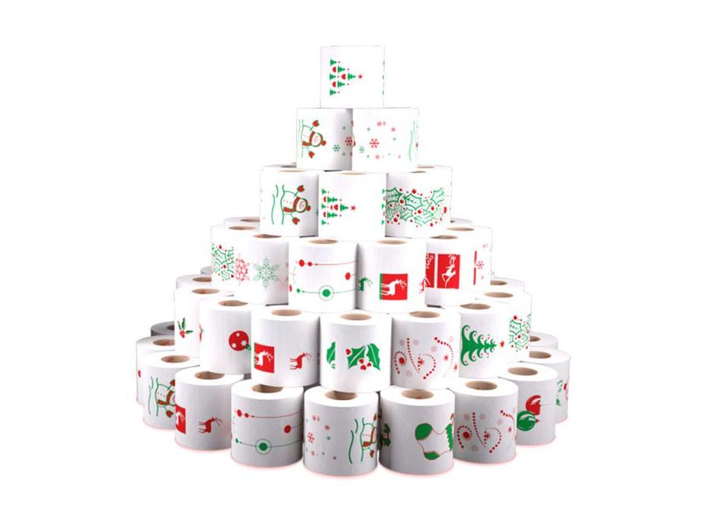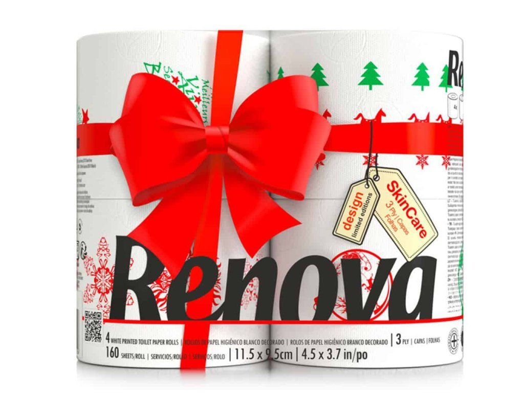 4 rolky toaletného papiera Renova Vianočná edícia 3vrstvový s celkovo 640 útržkami.