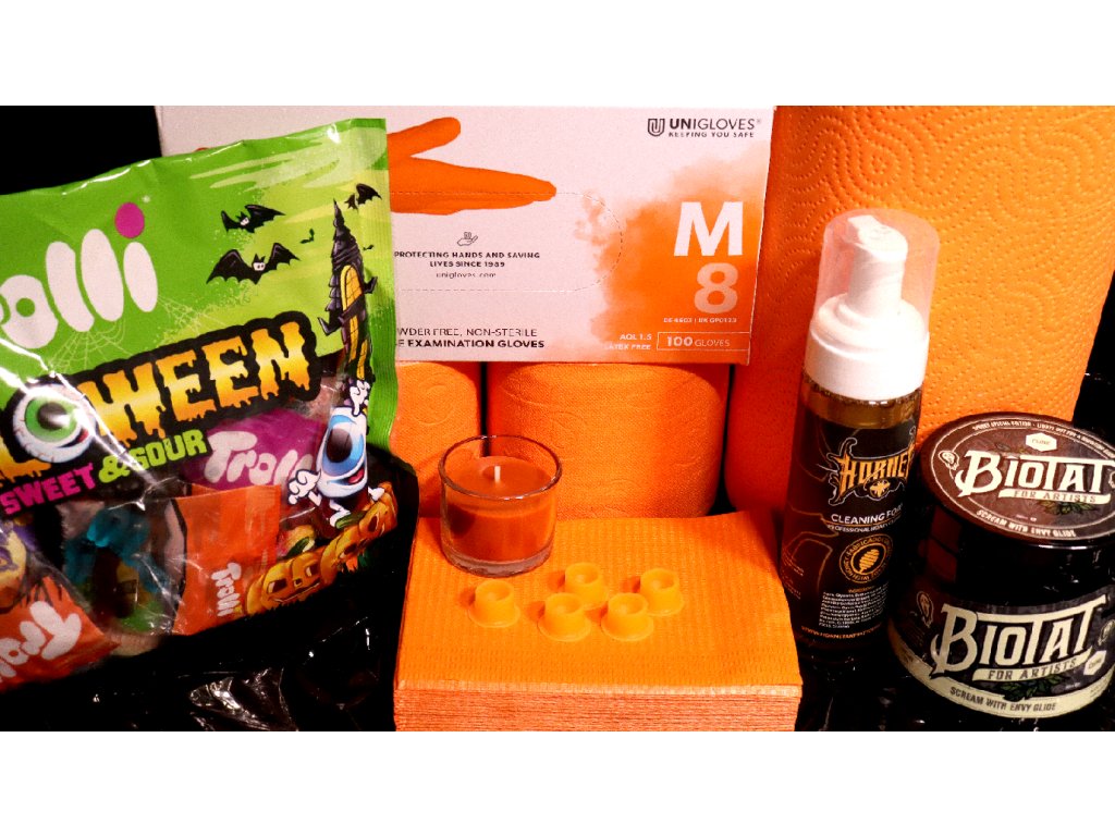Spooky Pumpkin Pack je ideálnou voľbou pre štúdiá, ktoré chcú mať pracovný priestor naladený na halloweensku náladu. Oranžové farby podložiek, rukavíc a papierových utierok dopĺňa vonná sviečka Yankee Candle s vôňou Pumpkin Cinnamon Swirl, ktorá do priestoru vnesie hrejivú jesennú vôňu. Súčasťou balíčka je aj BIOTAT Scream s Glide Envy gél – limitovaná edícia znecitlivujúceho pracovného gélu vo 500 g balení. Pack dopĺňajú sterilné silikónové kalíšky The Inked Army a tematické sladkosti Trolli Halloween Party Mix.