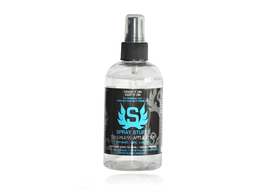 Spray Stuff vychádza zo zloženia produktu Stencil Stuff. Po nakreslení motívu prestriekajte mierne sprejom Spray Stuff a motív vydrží na pokožke neuveriteľne dlho. Odstránenie možné prípravkom obsahujúcim alkohol. Jeden sprej vydrží cca 4 - 6 mesiacov.