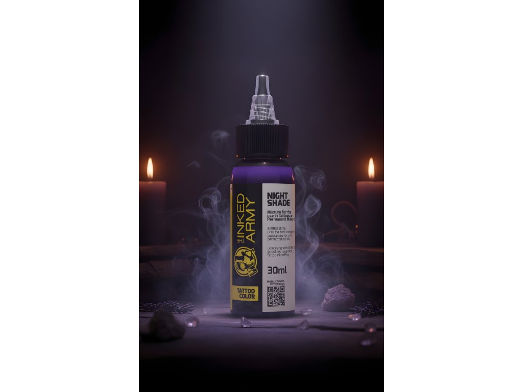 THE INKED ARMY Night Shade je intenzívna tmavofialová zo série profesionálnych tetovacích farieb vyrábaných v Nemecku. Tento odtieň prináša výraznú hĺbku a sýtosť, ktorá umožňuje vytvárať temné, dramatické časti aj plynulé prechody do svetlejších tónov.