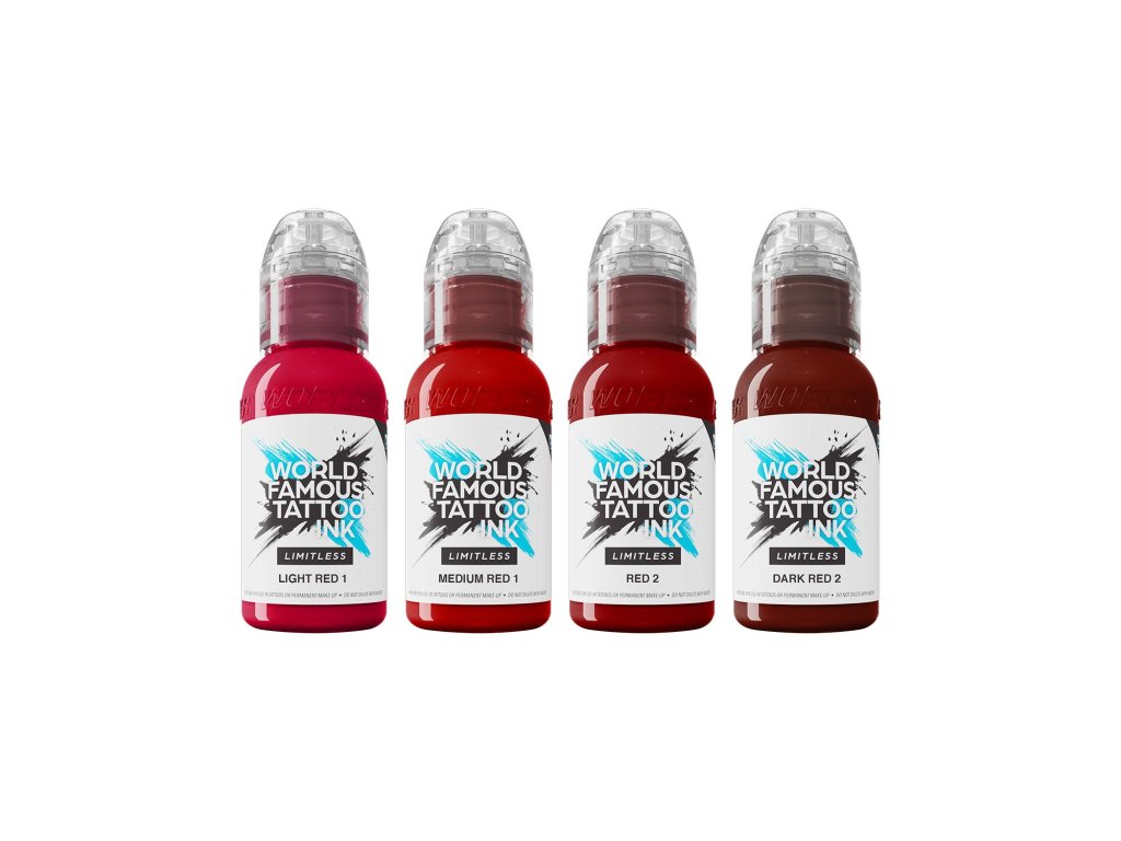 World Famous Limitless Shades of Red Collection je sada 4 fľaštičiek tetovacích atramentov v rôznych odtieňoch červenej. Atramenty sú vyvinuté tak, aby spĺňali najnovšie normy EÚ REACH (platné od januára 2023) a sú bezpečné aj pre európsky trh. Limitless rada bola vytvorená ako moderný štandard, ktorý kombinuje vysokú kvalitu a reguláciami overenú bezpečnosť.